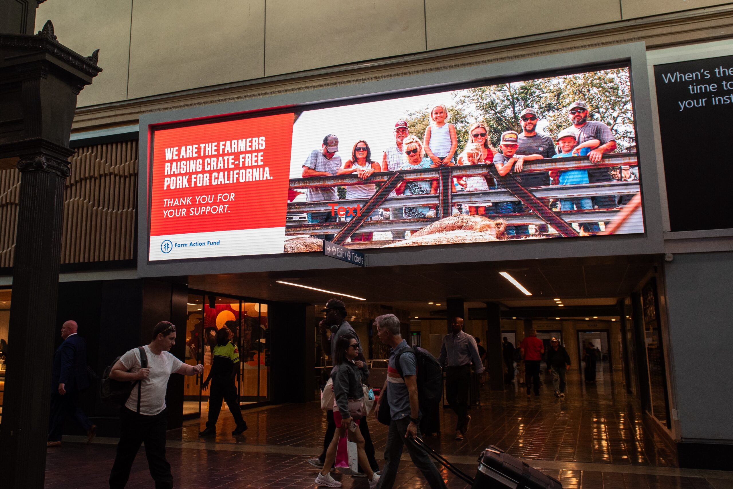Meanwhile, Farm Action and Farm Action Fund bought ads across Union Station and Reagan Airport, hired a mobile billboard to circle the Capitol and sent postcards in every legislator’s mailbox saying, “Thank you for supporting Prop 12.”
